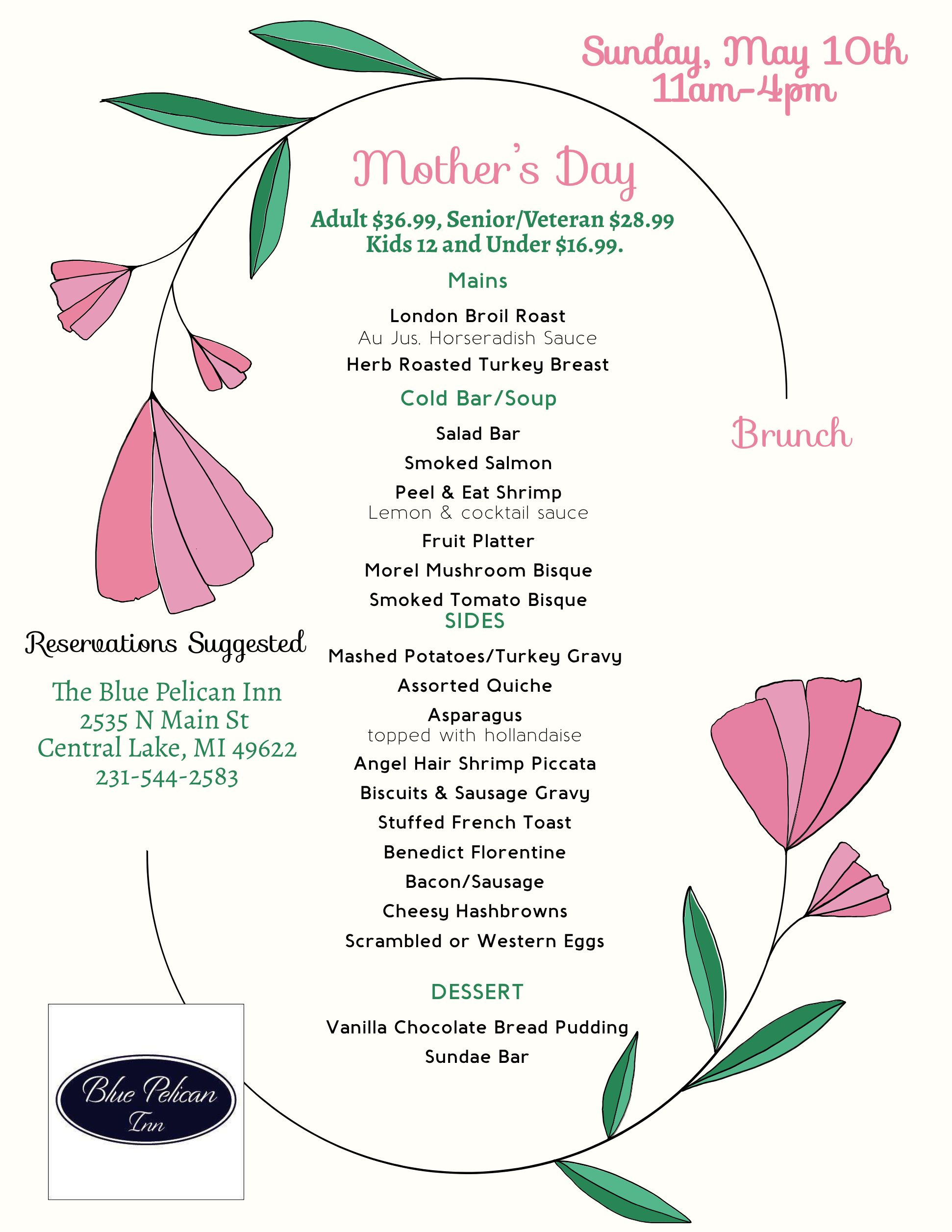 Sunday May 10th Mother’s Day Brunch 11am-4pm No Regular Breakfast Service